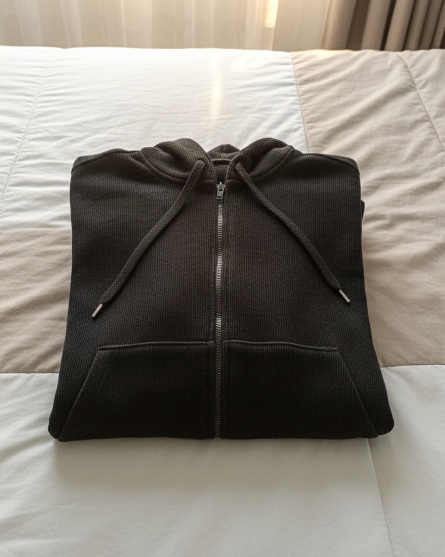سويتشيرت رجالي سوستة أسود مستورد معمول علشان يديك إحساس الفخامة والراحة من أول لبسة. مُبطَّن من الداخل بخامة ناعمة تحافظ على دفء جسمك وتخلّيك مرتاح طول اليوم، مع نسيج مضلّع أنيق يدي شكل فخم ولمسة عصرية واضحة. تصميم عملي بسوستة أمامية وكابيشو مريح يخليك جاهز لأي خروجة، جامعة أو مشوار سريع، من غير تفكير. قطعة أساسية تليق بكل الستايلات وسهلة التنسيق، هتلبسها كتير وهتعتمد عليها في الشتاء.